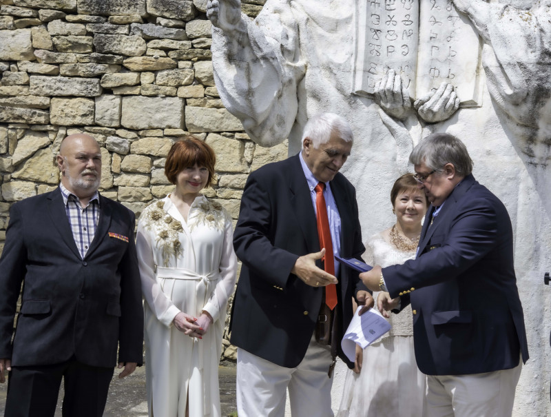 На фото: генерал-майор ООН Павлет Найденов награждает Ивайло Петрова орденом «Голубь мира» у памятника святым Кириллу и Мефодию в Плиске.