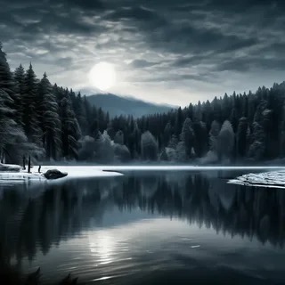 Приблизил. Бескрайнее белое полотно тайги. И на берегу озера — чёрный, идеально круглый участок. Снег не лежал на нём. Совсем. Край был резким, абсолютно чётким, без переходов.