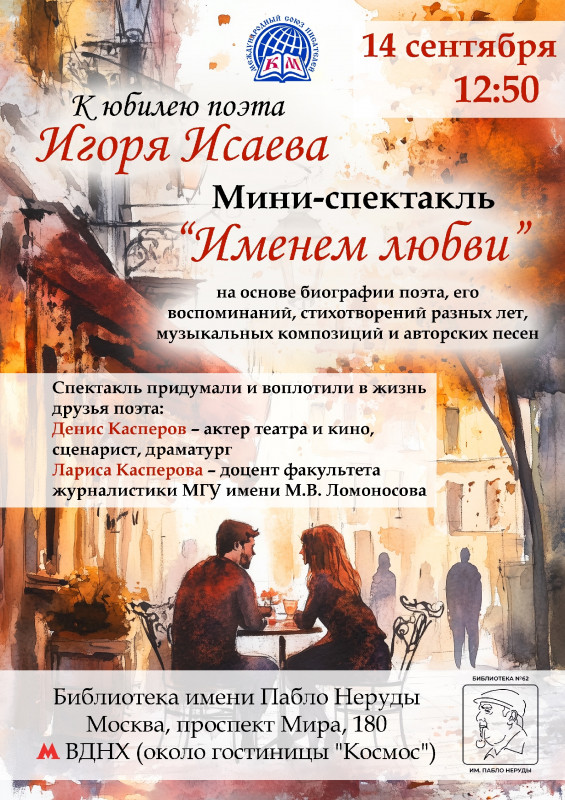 К юбилею члена правления МСП (КМ), руководителя сектора «Поэзия» Литературного клуба «Писатели за Добро» Игоря Исаева приглашаем вас на мини-спектакль «Именем любви».