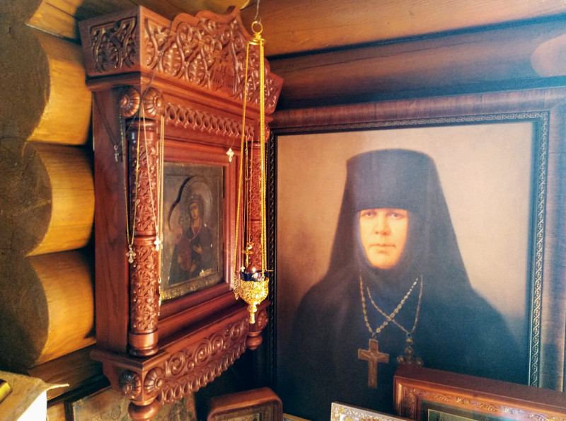 На фото фрагмент презентации: чудотворная икона Леушинского Иоанно-Предтеченского монастыря и портрет игуменьи Таисии (Солоповой), ставшие прообразами для романа «Призраки затонувшего города».