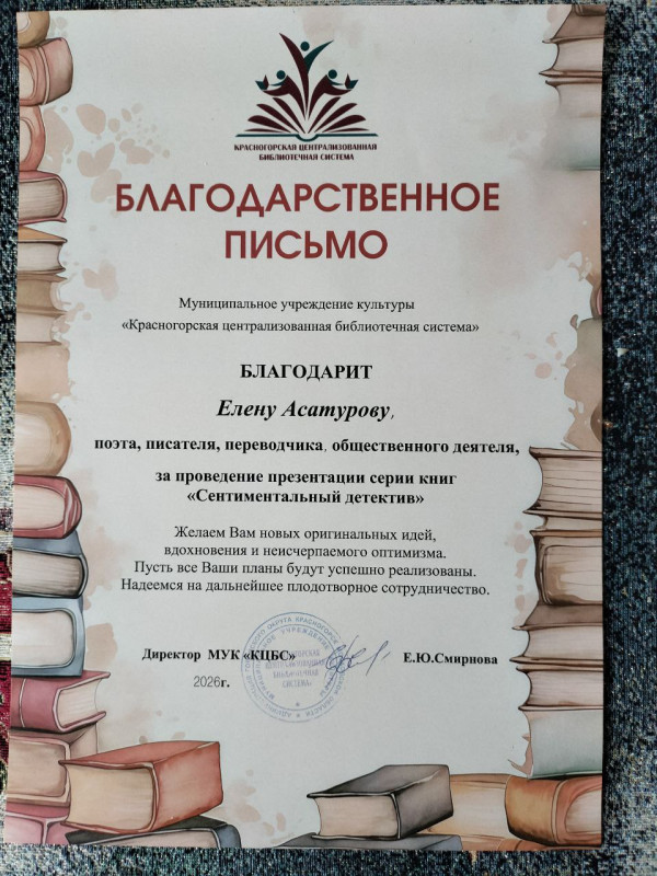 Итак, дорогие друзья, я готова поделиться впечатлениями от презентации моей книжной серии «Сентиментальный детектив Елены Асатуровой» в Центральной библиотеке Красногорска, которая состоялась 1 февраля.