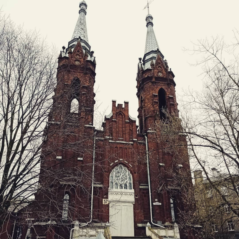 На фото фрагмент презентации: костёл Святого Сердца в Рыбинске, где разворачиваются события романа «Опасные тени прошлого».