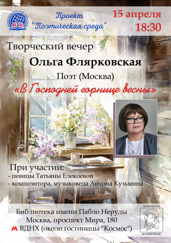 Проект «Поэтическая среда» и его ведущий Игорь Исаев приглашают на творческий вечер поэта Ольги Флярковской, которая была гостьей рубрики «Редакционный портфель»: Редакционный портфель. Выпуск 23. Ольга Флярковская.