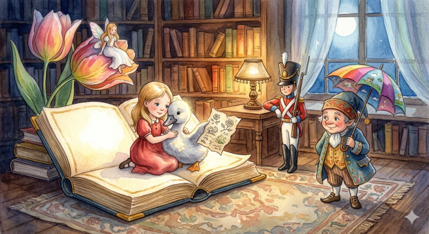 В одном уютном старинном шкафу, прямо на верхней полке, жили сказки Ханса Кристиана Андерсена. Каждый год 2 апреля, в самый главный праздник всех читателей, книги устраивали большой бал. Герои сходили со страниц, делились историями и пили чай из крошечных фарфоровых чашек.