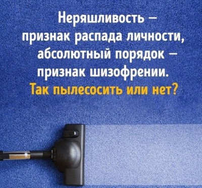 Знаете, Елена, приучая детей к порядку, а у меня два сына, я говорила известную фразу: «Чисто не там, где убирают, а там, где не мусорят». Вот и для нас нет другого пути. А пылесосить я сегодня не стала!