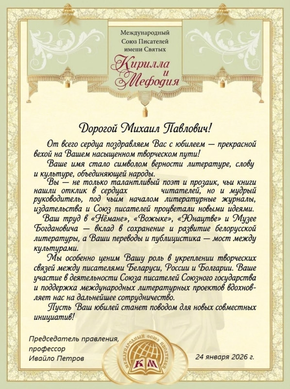 Наш поздравительный адрес уже в Минске. А эта статья будет опубликована в следующем номере альманаха «Под знаком Кирилла и Мефодия».