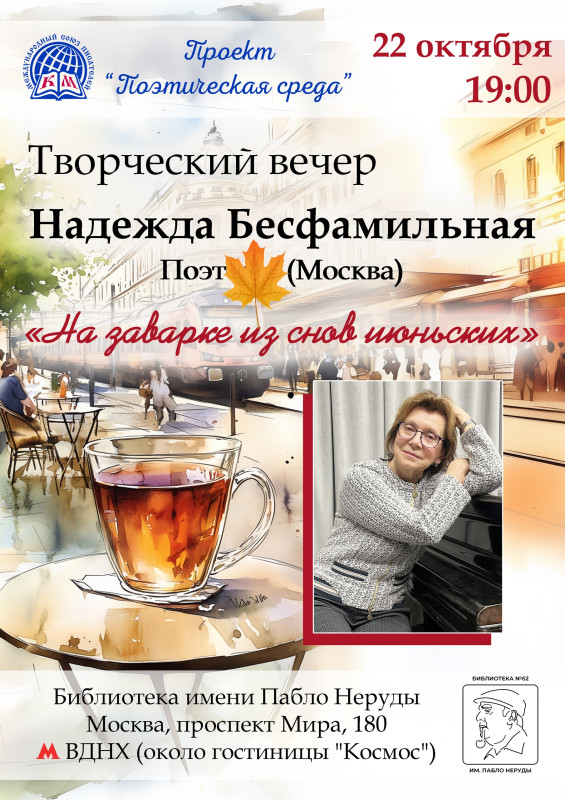 В среду, 22 октября, в библиотеке им. Пабло Неруды в Москве состоится творческий вечер поэта Надежды Бесфамильной.