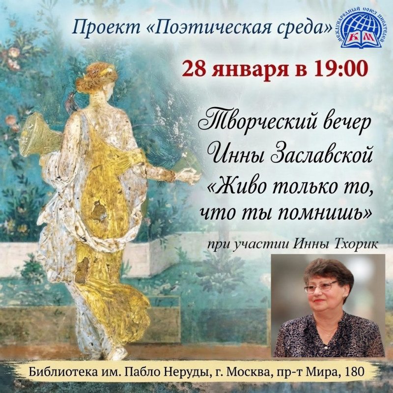В минувшую среду 28.01.2026 г. в рамках проекта литературного клуба МСП КМ «Поэтическая среда» с успехом прошёл творческий вечер замечательного современного поэта Инны Заславской «Живо только то, что ты помнишь».